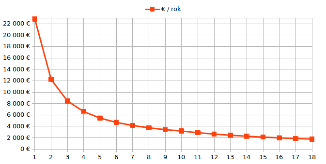 Dáta mám len za 4 roky. Takže som skúsil spraviť predikciu tak že ročné náklady sú 900€ a ročný nájazd kilometrov 12000.