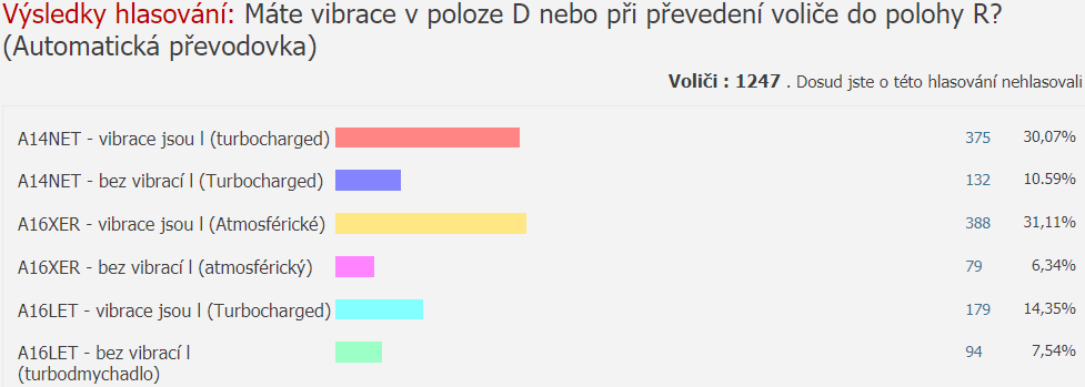 Na astraclub.ru mají zajímavé hlasování (sice pro motory s automatickou převodovkou). To vlákno tam má přes 60 stran a co jsem trochu nahlídl, tak některým v servisech tvrdí, že to je vlastnost, takže normální. Řeší se tam cokoliv, svíčky (prý i podfukují), zatížení alternátoru, spalování + směs + 98 benzín, klikovka, silentbloky atd. Dokonce tam pořádali nějakou petici (nespokojenost, stížnost na servisy apod.), kterou zaslali GM.