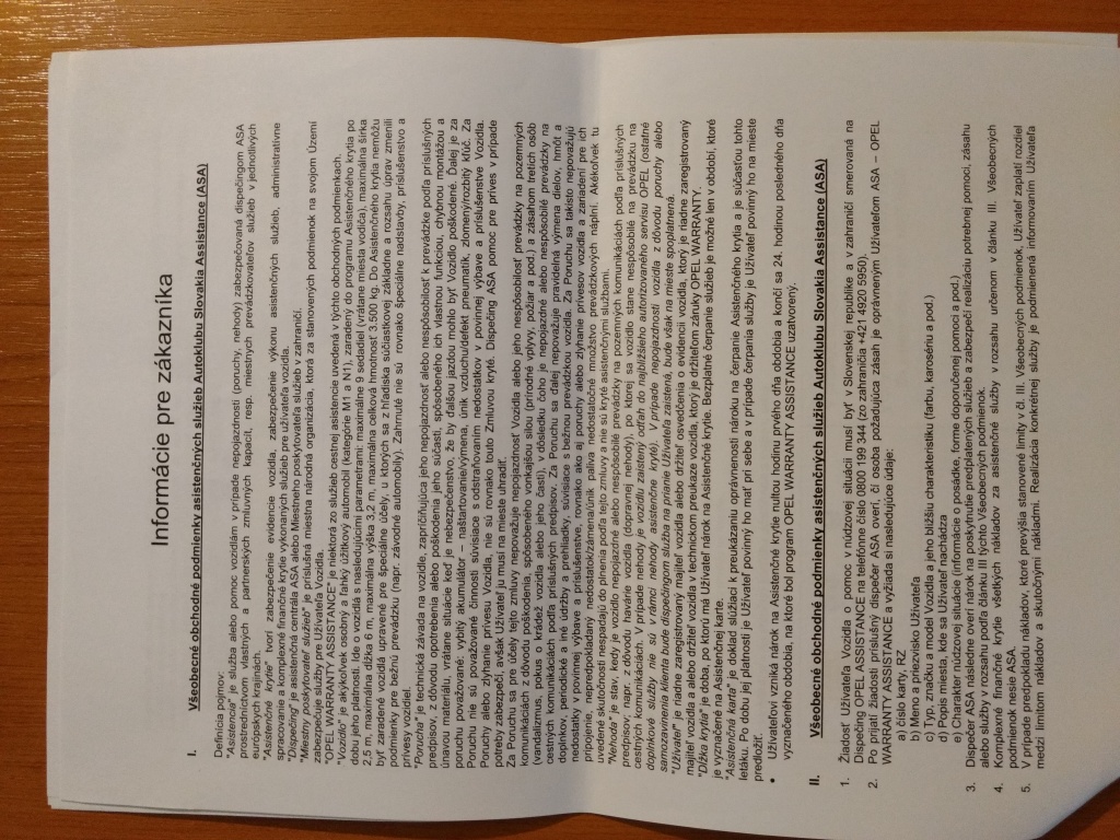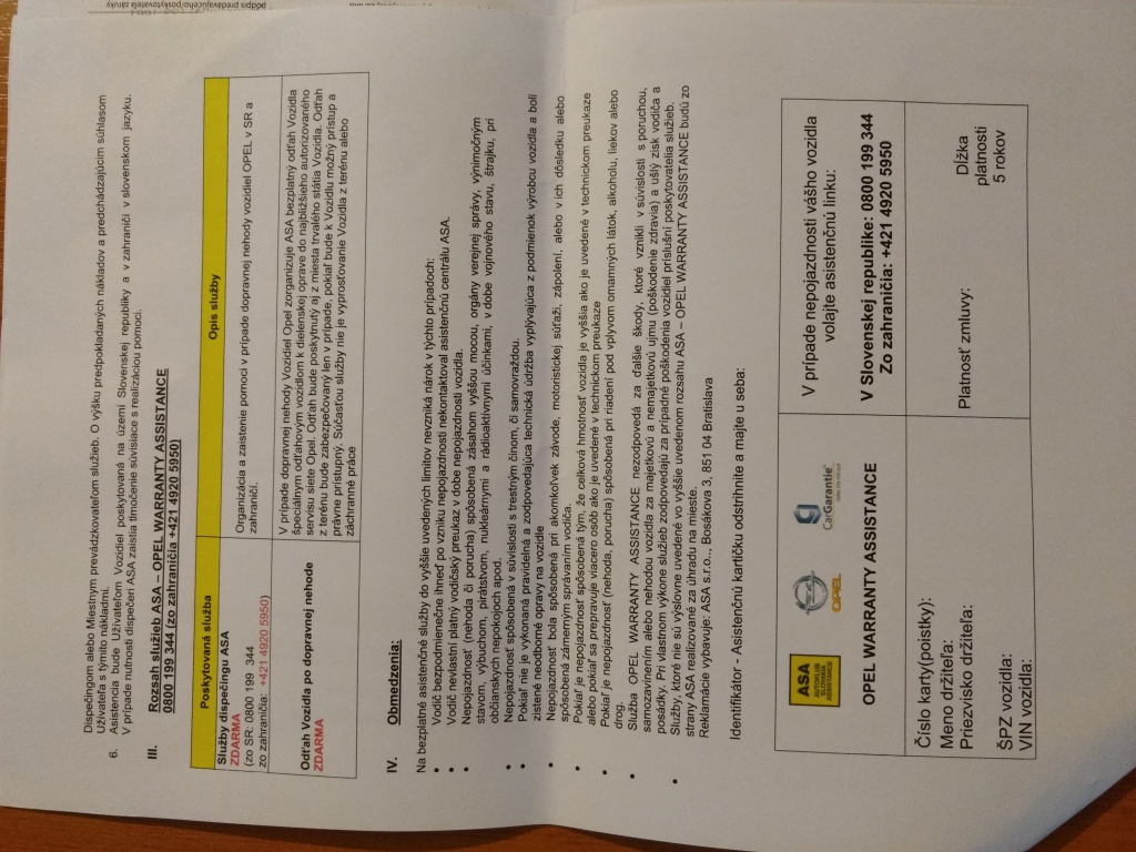 Situace je následovná, a to taková. Včera jsem si procetl všechny papíry co máme k vozu a pak jsme volal na OPEL asistenci a vše jsem si nechal důkladně vše prověřit. Mám zakoupenou +3 FULL FROM START a to samozřejmě obsahuje i odtah vozidla při poruše a nebo nehodě. Co ale je problém, že v databázi u našeho vozu není tento příznak a tak se hledalo proč. Důvod je ten, že sice kartička mi byla vypsána, alena poslední straně všeobecných podmínek je tabulke, kde nejsiz vyplněny všechny potřebné údaje o voze a datum s podpisem autorizovaného prodéjce. Je to i má hloupost, protože jsem si toho nevšiml a myslel jsem si že postací ta kartička. Naštěstí to je v pohodě a během 2 leté záruky, kdykoliv si šlověk může koupit prodlouženou a tak dnes jedi do OPELU ze všemi dokumenty a budu žádat nápravu. Aby mi všechny dokumenty vypsali, potvrdily razítkem a nechali zapsat do databáze u OPEL ASISTENCE. Poté je tento dokument potřeba vozit sebou v autě.