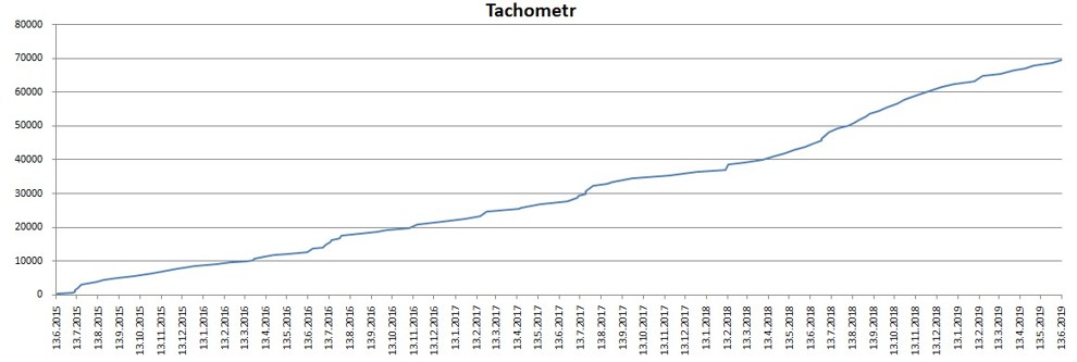 za tyto 4 roky mám na tachometru 69554 km. (za první rok 12719 km, za druhý 15049, za třetí 17026 a za čtvrtý 24760). Průměrně za rok 17388 km.